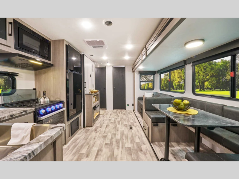 Sleeps 6 Slides 2 Length 35 ft 11 in Ext Height 11 ft 3 in Int Height 6 ft 8 in Interior Color Carbon, Savannah Hitch Weight 920 lbs Dry Weight 6850 lbs Cargo Capacity 2830 lbs Fresh Water Capacity 44 gals Grey Water Capacity 78 gals Black Water Capacity 28 gals Available Beds Queen Refrigerator Type 12V Refrigerator Size 10 cu ft Number of Awnings 1 LP Tank Capacity 20 lbs Water Heater Type On Demand Tankless AC BTU 13500 btu Awning Info 14' Power w/LED Light Axle Count 2 Number of LP Tanks 1 Shower Type Standard Similar Floorplans