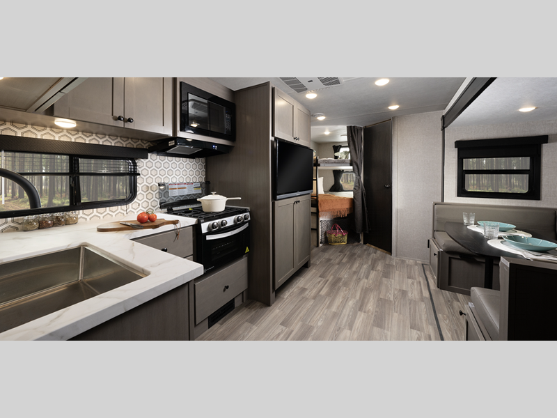 Sleeps 9 Slides 1 Length 30 ft 6 in Ext Width 8 ft 1 in Ext Height 11 ft Int Height 6 ft 9 in Interior Color Washed Driftwood Hitch Weight 800 lbs GVWR 7600 lbs Dry Weight 6050 lbs Cargo Capacity 1550 lbs Fresh Water Capacity 45 gals Grey Water Capacity 29 gals Black Water Capacity 29 gals Tire Size ST205/75R14D Furnace BTU 30000 btu Number Of Bunks 2 Available Beds Queen Refrigerator Type 12 Volt Refrigerator Size 10 cu ft Cooktop Burners 3 Number of Awnings 1 LP Tank Capacity 30 lbs Water Heater Capacity 6 gal Water Heater Type Gas/Electric AC BTU 15000 btu TV Info LR Smart HDTV Awning Info 20' 6" Power w/LED Lighting Axle Count 2 Number of LP Tanks 2 Shower Type Tub/Shower Combo Similar Floorplans